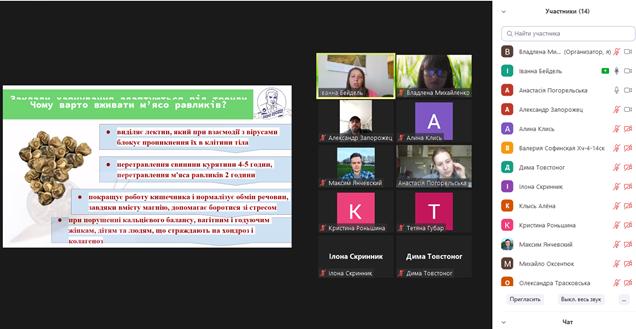 У розрізі теми лекції «Особливості використання равликів у ЗРГ», спікерка розповіла магістрантам про класифікацію та харчову цінність равликів, їх щоденний раціон, оптимальні кліматичні й географічні умови для їхнього вирощування. Обґрунтувала економічну доцільність ведення такого виду бізнесу в нашій державі та якими нормативними документи необхідно керуватися, щоб працювати в межах законодавства України.