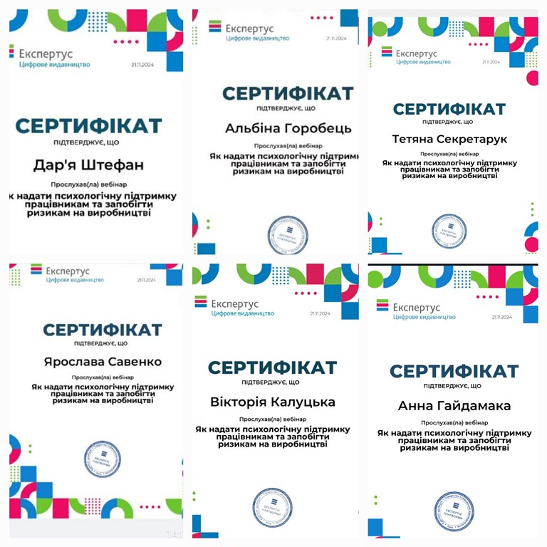 21 листопада 2024 року здобувачки 3-4 курсу освітньо-професійної програми «Менеджмент персоналу» Анна Гайдамака, Вікторія Калуцька, Марина Ширитович, Дар'я Скотаренко, Ярослава Савенко, Тетяна Секретарук, Альбіна Горобець, Дар'я Штефан разом із гаранткою програми, професоркою Оленою Драган і доценткою Оленою Безпалько взяли участь у онлайн-вебінарі «Як надати психологічну підтримку та запобігти ризикам на виробництві» від практичної психологині Олени Калємі.