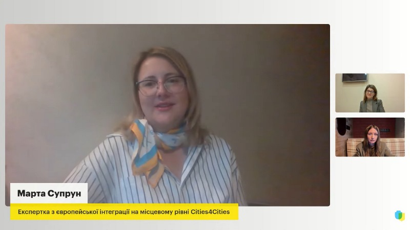 Спікерками вебінару стали Вікторія Якименко та Уляна Сидор – представниці Департаменту міжнародної технічної допомоги СКМУ, які поділилися досвідом координації європейських інструментів транскордонного, транснаціонального та регіонального співробітництва. Учасники обговорили, які сім програм Interreg відкриті для України, у чому полягає різниця між ними та як громадам обрати оптимальний формат співпраці.