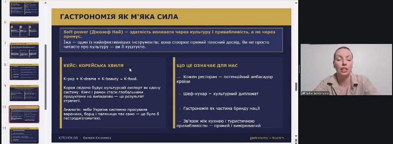 На прикладі «корейської хвилі» (K-food) студенти побачили, як системне просування національних страв – кімчі, рамену – стає частиною глобальної стратегії культурного експорту. Євгенія Клименко підкреслила, що Україна має потужний ресурс – «різні кулінарні світи» в межах однієї країни (галицька, полтавська, одеська, закарпатська кухні), водночас для їхнього розвитку потрібна системна стабільність.