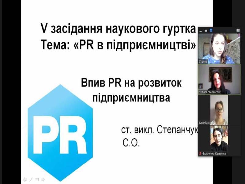 Світлана розпочала засідання зі вступного слова «Вплив PR на розвиток підприємництва», висвітливши зв'язок підприємця та піарщика на шляху побудови прозорих бізнес-комунікацій. Викладачка розповіла про перспективні напрями реалізації PR у бізнесі, тонкощі Рublic affairs та Сommunity relations, про те, як Еmployee relations впливають на корпоративну культуру, а Сonsumer relations задають стріми сучасного маркетингу.