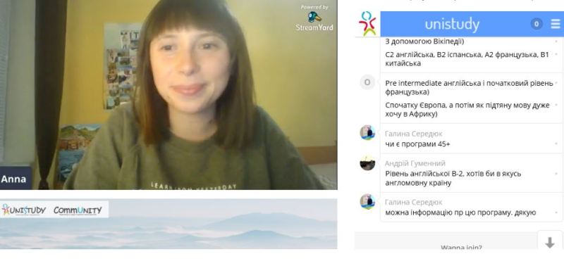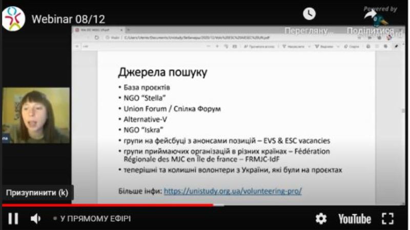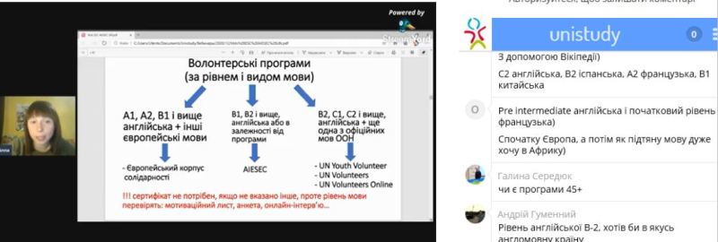 Відтак, під час участі у вебінарі «Волонтерство без обмежень», організованому Unistudy, були розглянуті: види волонтерських програм для молоді, джерела розміщень анонсів програм волонтерста та їх вимог, вагомість волонтерського досвіду при прийомі на роботу, зокрема включення його до резюме, супровідний чи мотиваційний листи, Європейський корпус солідарності, волонтерство ООН, онлайн-волонтерство, AIESEC та інші можливості.