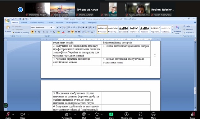 Під час обговорення робоча група, до складу якої увійшли викладачі та стейкхолдери, директор Спілки «Борошномели України» Родіон Рибчинський і начальниця лабораторії ТОВ «АР Бориспіль» Руслана Константинова, зосередила увагу на таких напрямках як оновлення змісту дисциплін із урахуванням сучасних вимог, дуальна освіта, матеріально-технічна база. При проведенні моніторингу були враховані рекомендації експертних груп НАЗЯВО за акредитаціями 2024 і 2025 рр., результати опитувань здобувачів освіти, випускників освітньої програми та роботодавців.