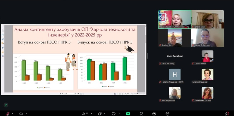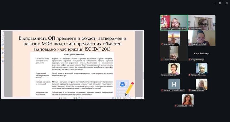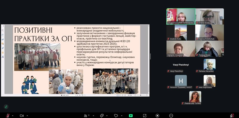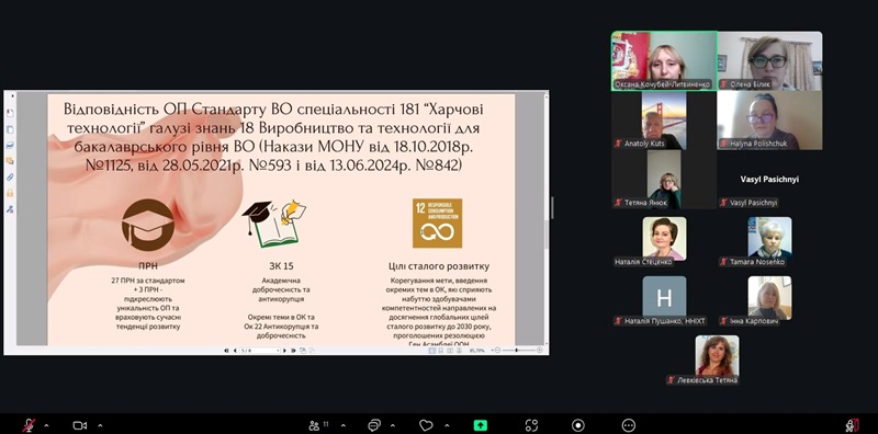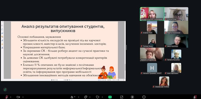 Ключовими темами для обговорення були: результати аналізу інформаційного, методичного і кадрового забезпечення освітнього процесу освітньо-професійної програми; зміни контингенту здобувачів освіти за ОП протягом 2022-2026 рр., відповідність вимогам Стандарту вищої освіти за спеціальністю «Харчові технології» з урахуванням змін у предметній області, затвердженій наказом МОН щодо їх змін відповідно до класифікації ISCED-F 2013; результати опитування здобувачів і випускників ОП; позитивні практики, реалізовані на ОП; основні напрями для її удосконалення, зокрема для підсилення зв’язку навчання і досліджень під час реалізації ОП.