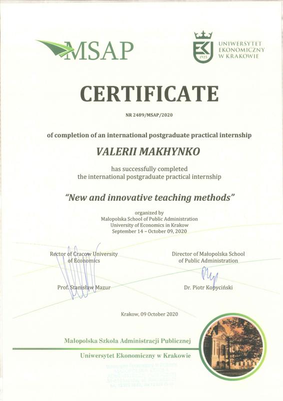 Для ознайомлення зі світовим і європейським досвідом надання освітніх послуг (у т.ч. в умовах карантинних обмежень, зумовлених пандемією) професор кафедри технології хлібопекарських і кондитерських виробів Валерій Махинько пройшов міжнародне науково-практичне стажування «Нові та інноваційні методи навчання». Воно було організоване Європейською лігою професійного розвитку із залученням провідних викладачів Малопольської школи державного управління на базі Краківського економічного університету (Польща).
