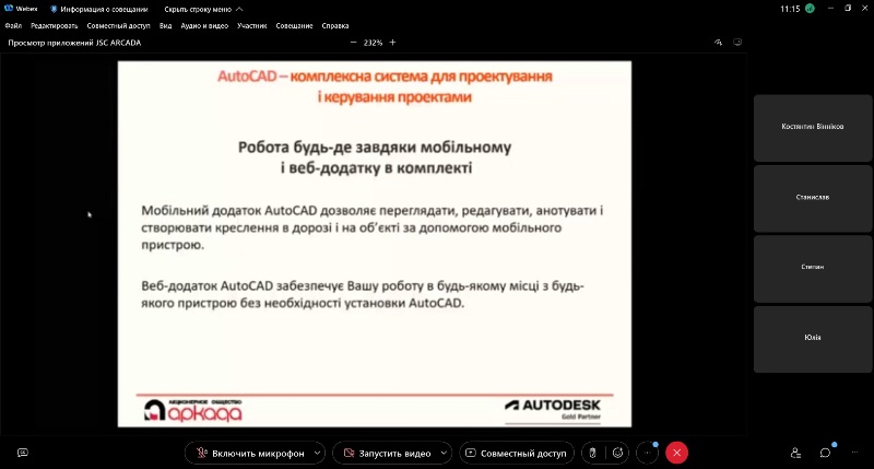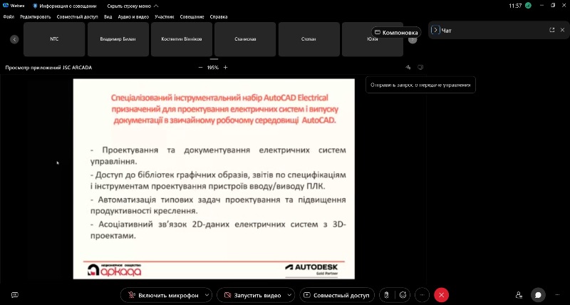 19 квітня 2023 року ПрАТ «АРКАДА» організувало вебінар «Проєктування електричних систем з динамічним створенням схемотехнічної документації в AutoCADElectrical», до якого долучилися викладачі кафедри електропостачання і енергоменеджменту.