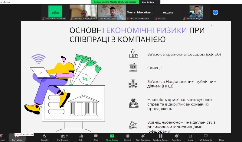 27 вересня 2023 року для здобувачів спеціальностей 071 «Облік і оподаткування», 072 «Фінанси, банківська справа, страхування та фондовий ринок», 073 «Менеджмент» і «Менеджмент персоналу» Навчально-наукового інституту економіки і управління НУХТ відбулася лекція «Можливості YouControl для системи економічної безпеки підприємства», яку прочитав бізнес-аналітик компанії YouControl Максим Зінченко.
