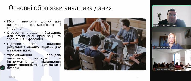 Викладач розповів майбутнім вступникам про задачі, переваги та особливості роботи на посаді аналітика даних, про кар'єрні можливості та перспективи на цій посаді. Наголосив на особистих рисах і навичках, які потрібні мати, щоб стати аналітиком даних, з чого почати, щоб заздалегідь підготуватися до навчання за цим напрямом.