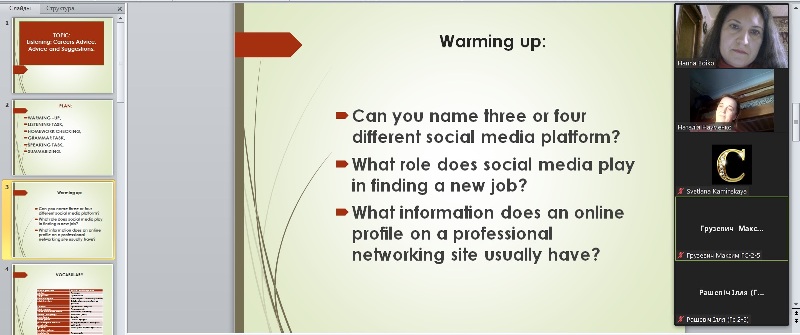 Під час заняття студенти прослухали аудіозапис із порадами, як покращити своє резюме та свій онлайн-профіль, щоб привернути увагу потенційних роботодавців. Здобувачі представили підготовлені вдома презентації, в яких розповіли про свої професійні якості і навели приклади, які ці якості демонструють. Студенти вчилися також надавати один одному поради щодо покращення резюме та вміння представити свої професійні якості.