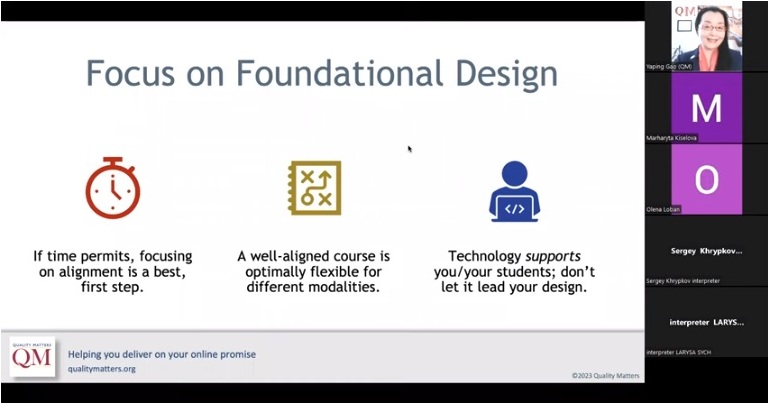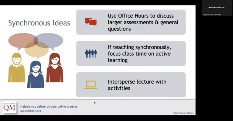 Спікерки з QM надали поради з дизайну та структури онлайн-занять, розповіли про шляхи залучення здобувачів освіти до активності під час дистанційних занять і важливість елементу інтерактивності, окреслили особливості синхронного й асинхронного навчання, поділилися прикладами об’єктивних методів оцінювання студентських робіт тощо. Вебінар був надзвичайно інформативним.