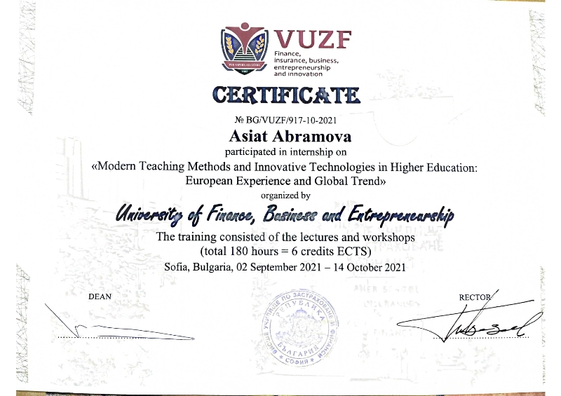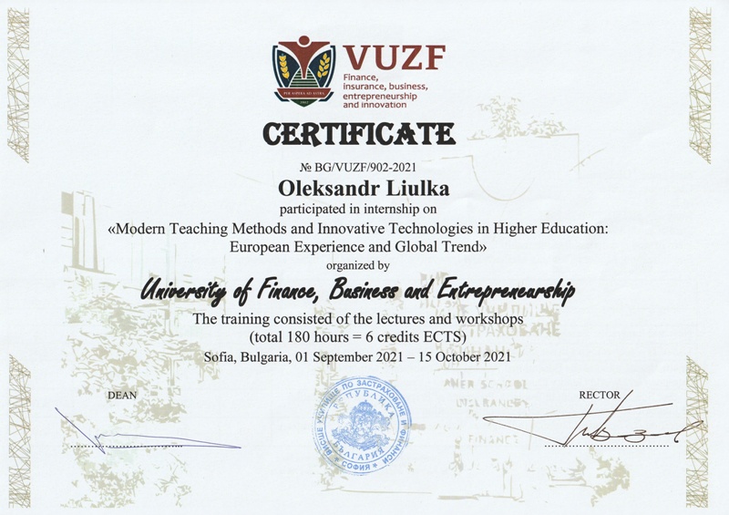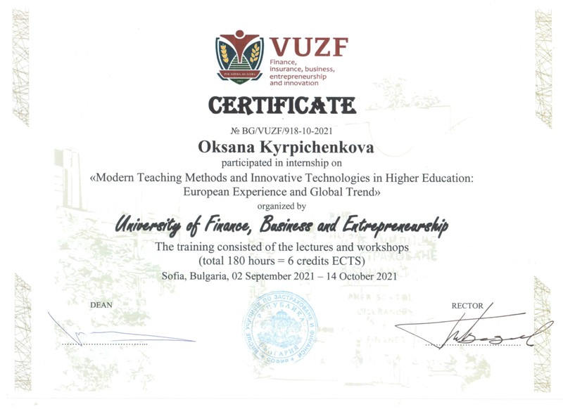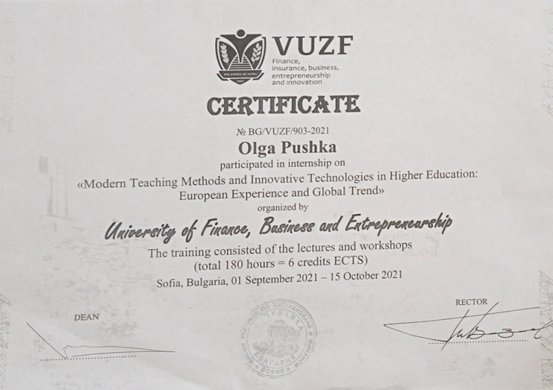 Викладачі кафедри готельно-ресторанної справи Олег Бортнічук, Олександр Люлька, В’ячеслав Губеня, Ольга Пушка, Оксана Кирпіченкова, Асьят Абрамова пройшли закордонне стажування в Університеті фінансів, професійної діяльності та підприємництва (м. Софія, Республіка Болгарія) за темою «Сучасні методи навчання та інноваційні технології у вищій освіті: європейський досвід та світові тенденції».