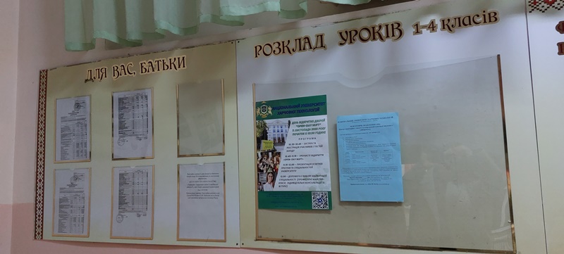 Разом із гімназистами старша викладачка вивісила програму Дня відкритих дверей на дошці об'яв для максимальної залученості учнів і роздала буклети з інформацією про вступ у 2024 році до нашого університету.