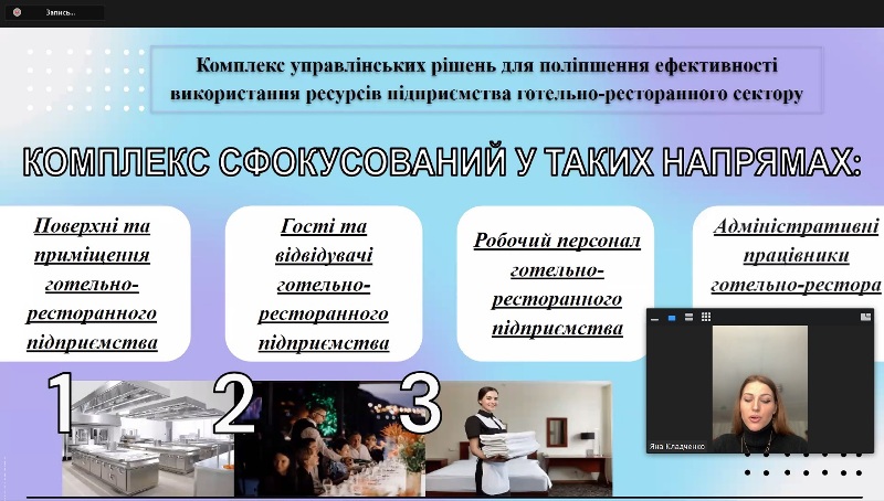 Магістранти представили до уваги екзаменаційної комісії актуальні роботи, в яких враховані сучасні виклики індустрії гостинності. За результатами науково-дослідної роботи магістрантів були опубліковані статті у фахових і закордонних виданнях, тези і матеріали доповідей міжнародних і всеукраїнських наукових конференцій, здійснена апробація в умовах закладів ресторанного господарства засобів розміщення.