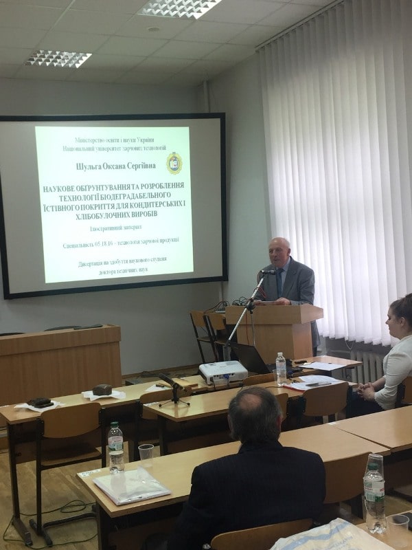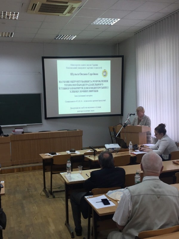 15 травня відбувся захист докторської дисертаційної роботи «Наукове обґрунтування та розроблення технології біодеградабельного їстівного покриття для кондитерських і хлібобулочних виробів» доцента кафедри експертизи харчових продуктів Оксани Шульги.
