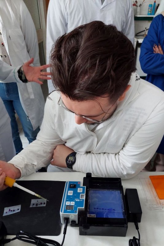 На занятті, що стосувалося електрофоретичного розділення нуклеїнових кислот, здобувачі готували пластинки з агарозного гелю, вчилися нашаровувати зразки в лунки гелю та проводити процес електрофорезу.