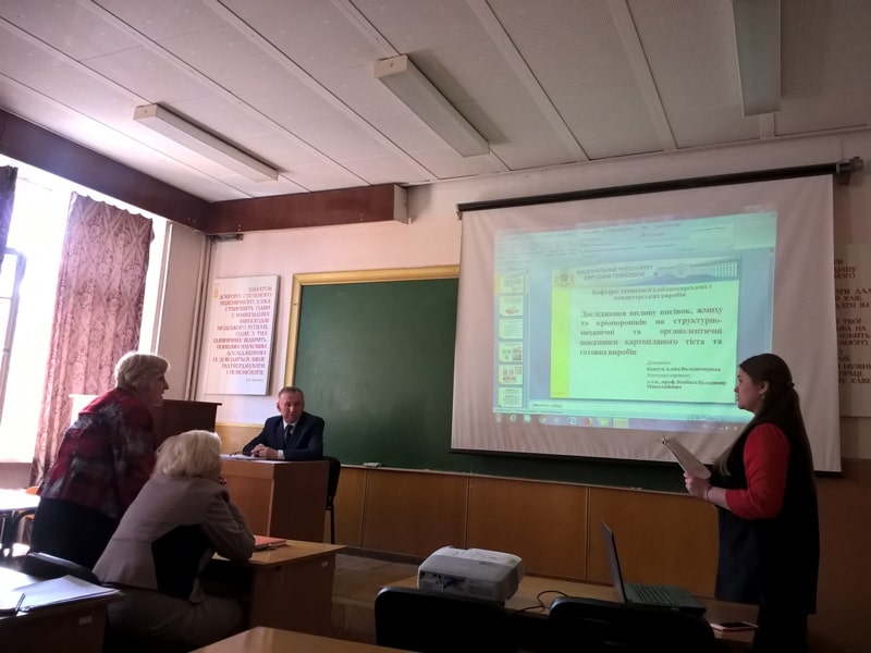 На кафедрі технології хлібопекарських і кондитерських виробів відбувся науковий семінар «Дослідження впливу висівок, жмиху та кріопорошків на структурно-механічні та органолептичні показники картопляного тіста та готових виробів» аспірантки Аліни Ковтун. Науковий керівник – завідувач кафедри технології хлібопекарських і кондитерських виробів, професор Володимир Ковбаса.