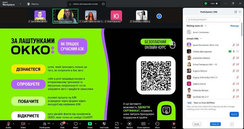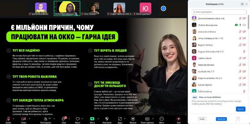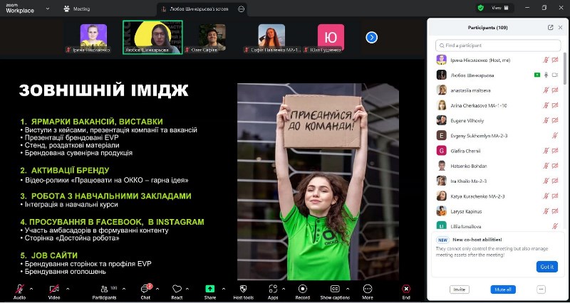 Лекторка детально пояснила, для кого та чому важливий бренд роботодавця; навела покроковий алгоритм побудови сильного бренду роботодавця з прикладом «ОККО»; роз’яснила інструменти роботи з брендом роботодавця, зокрема, як внутрішній і зовнішній імідж компанії впливають на залучення та утримання співробітників. Особливу увагу приділено практичним аспектам – етапам створення бренду роботодавця, внутрішнім дослідженням, програмам амбасадорів бренду та важливості залучення працівників до розвитку компанії.