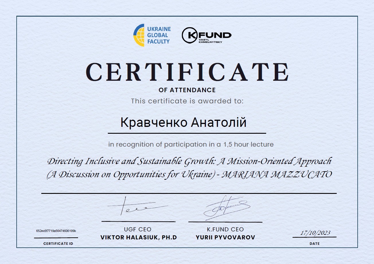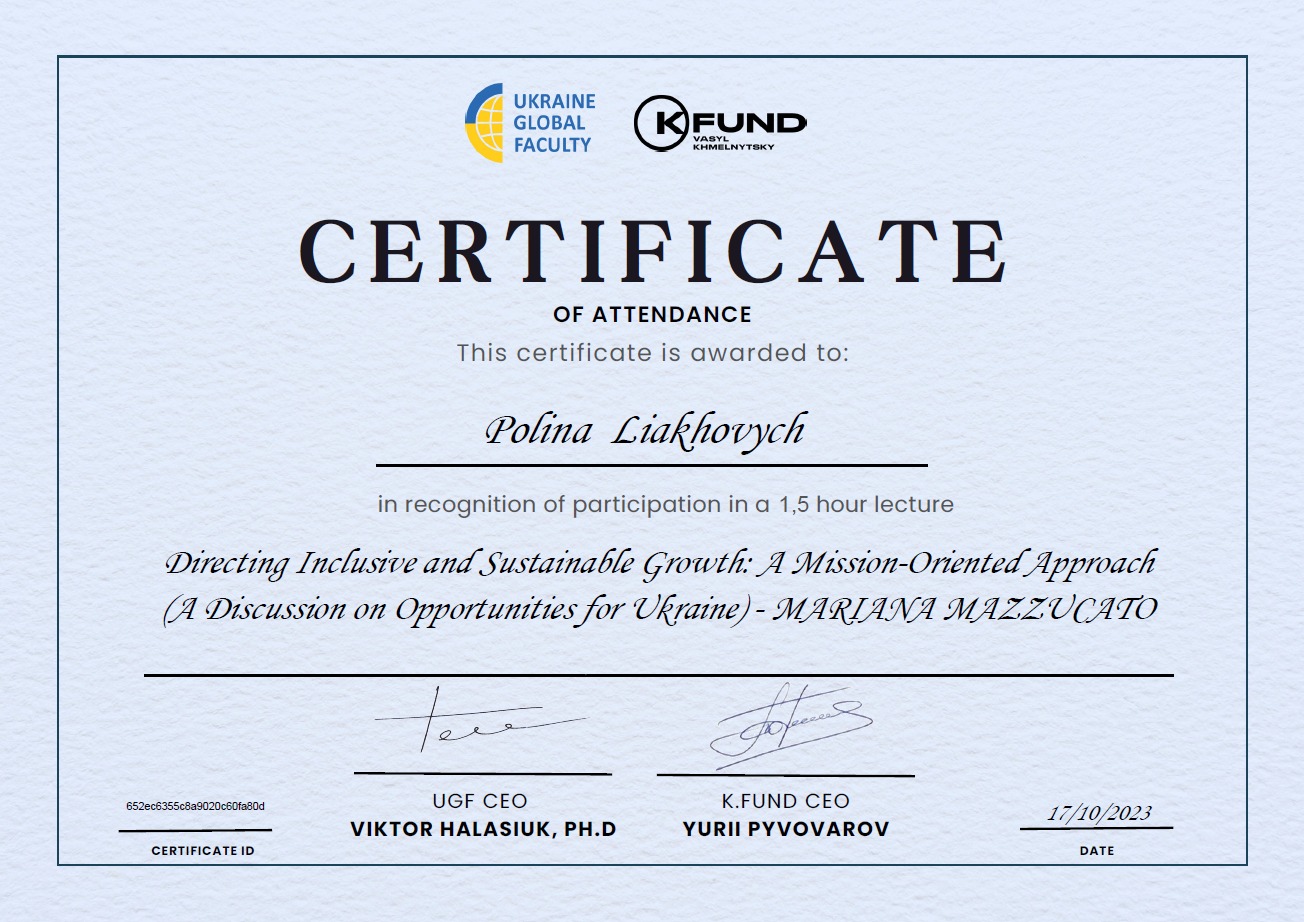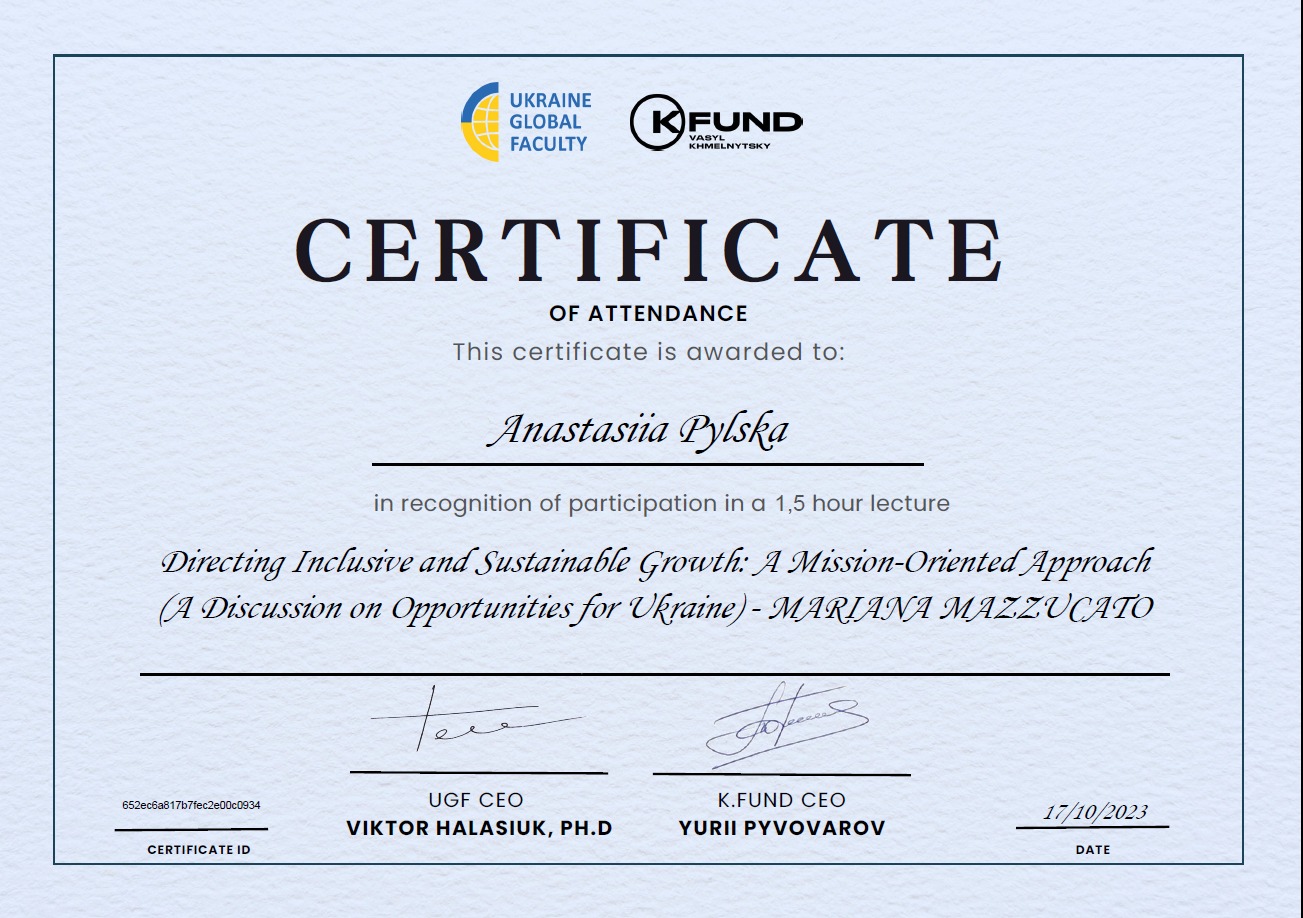 17 жовтня 2023 р. здобувачі освітнього ступеня «Бакалавр», освітньо-професійної програми «Технології харчування» та освітнього ступеня «Магістр», освітньо-професійної програми «Технології в ресторанному господарстві» прослухали онлайн-лекцію «Спрямування інклюзивного та сталого зростання: місійно-орієнтований підхід (обговорення можливостей для України)» від професорки Університетського коледжу Лондону (UCL), директорки-засновниці UCL Institute for Innovation & Public Purpose (IIPP), докторки філософії, авторки книг «Підприємницька держава», «Цінність усього», «Економіка місії» та «Велика афера» Маріани Мацукато.