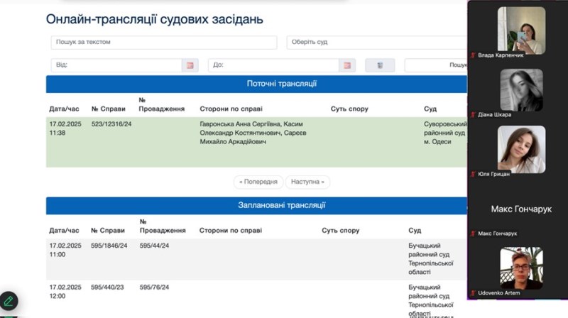 Навчання – це процес довжиною у життя, тому наші здобувачі і у вільний час відкривають для себе нові горизонти для підсилення своєї компетентності відповідно до фаху. З цією метою студенти 4 курсу спеціальності 051 «Економіка», освітньо-професійної програми «Економіка та правове забезпечення бізнесу» разом із доценткою кафедри економіки і права Мар’яною Задніпряною-Корінною користуються правом наданим державою в рамках судової реформи для вивчення принципу гласності і відкритості судового процесу. На сайті судової влади України відкритий доступ до публічних засідань суду. Завдяки цьому кожний має змогу бути присутнім як вільний слухач на трансляціях відкритих судових процесів. Висока зацікавленість реальним перебігом судового засідання спонукала здобувачів із наставницею дослідити, як сучасні технології полегшують надання інформації учасникам судового процесу.