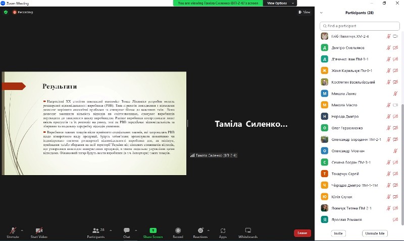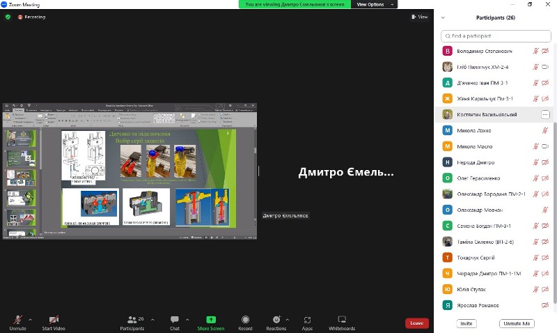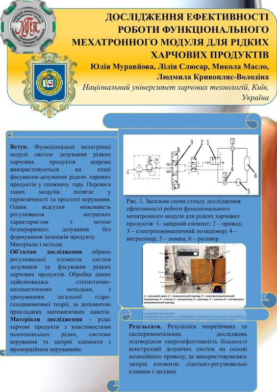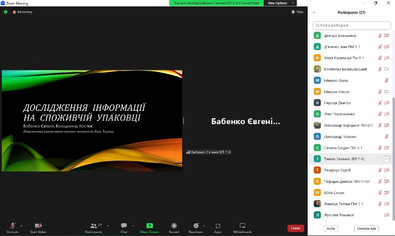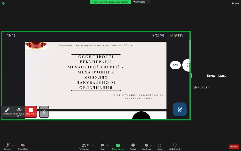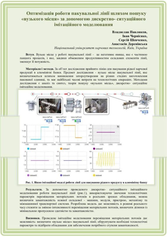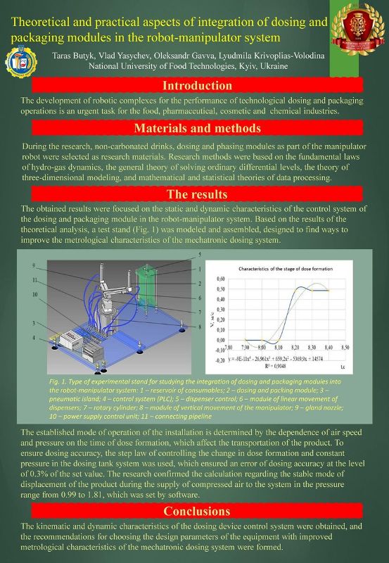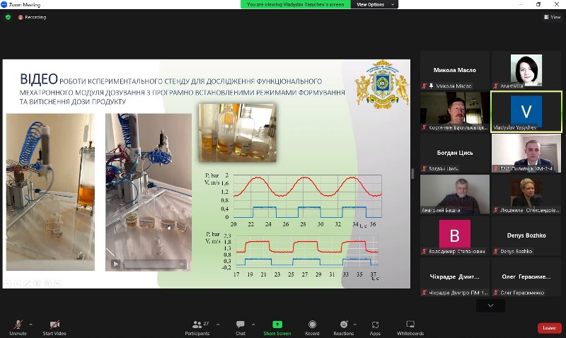 Доповідали: Богдан Цись про особливості рекуперації механічної енергії у мехатронних модулях пакувального обладнання; Влад Ясичев щодо теоретико-практичних аспектів інтеграції дозувально-фасувальних модулів у системі робота-маніпулятора; Дмитро Ємельянов про систему пневматичних приводів soft-захватних пристроїв для транспортування крихких виробів; Гліб Пилипчук щодо впливу агресивного середовища на властивості міцності технічних волокон; Євгенія Бабенко про дослідження інформації на споживчій упаковці; Таміла Силенко щодо розширеної відповідальностіь виробника в Законі України «Про управління відходами».