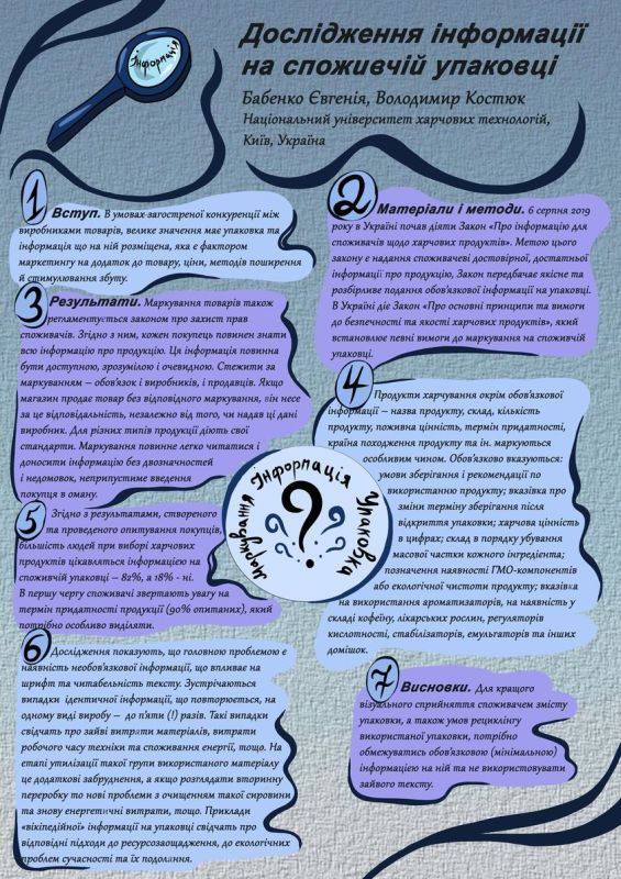 На конференцію здобувачі надали свої напрацювання щодо теоретичних досліджень та аналізу характерних технологічних процесів і засобів, реологічних властивостей, особливостей виготовлення, дизайну, збирання та перероблення пакувальних матеріалів, т також свої розробки технічних систем та їх втілення.