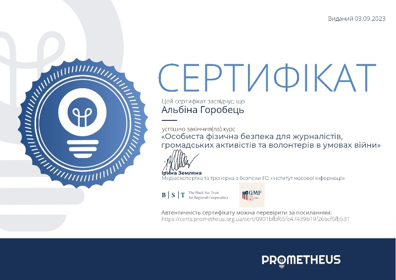 Здобувачки освіти 3 курсу освітньо-професійної програми «Менеджмент персоналу» Альбіна Горобець, Тетяна Секретарук і Вікторія Овадюк у межах програми дисципліни «Соціально-економічна безпека» пройшли курси Prometheus і отримали персональні сертифікати.