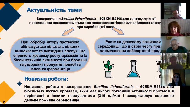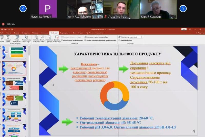Усі здобувачі під час захистів представили презентації своїх кваліфікаційних проєктів. Тематика робіт була абсолютно різного спрямування: одержання дріжджових біомас, отримання кислот і ферментів, вітамінів та антибіотиків. Також були представлені і роботи, пов’язані з культивуванням мікроорганізмів для отримання готових продуктів, таких як «Вертицилін» чи «Біоспорин».