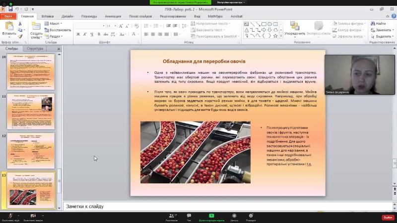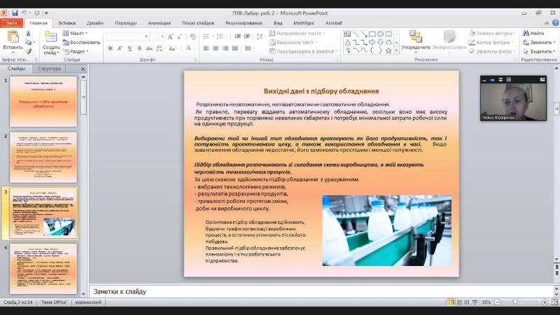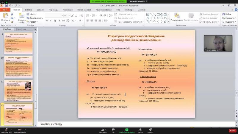 Теоретичний матеріал до лабораторного заняття був викладений змістовно, інформативно, супроводжувався демонстрацією презентації. Оскільки завдання до практичної частини лабораторного заняття розміщені на платформі дистанційного навчання, викладачка зосередила увагу на особливостях виконання даної роботи, зазначила основні етапи проведення розрахунків та підбору провідного технологічного обладнання.