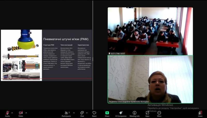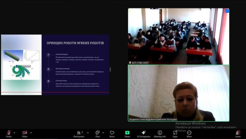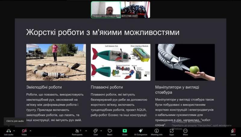 Також викладачка розповіла про сучасні технології та біоміметику, які змінюють уявлення про машини: електроактивні полімери (EAP), що імітують м’язи живих істот; пневматичні штучні м’язи (PAM) для створення гнучких роботів; роботів нового покоління від Boston Dynamics – Spot і Atlas й акцентувала на філософії, етиці та майбутньому професії.