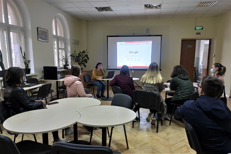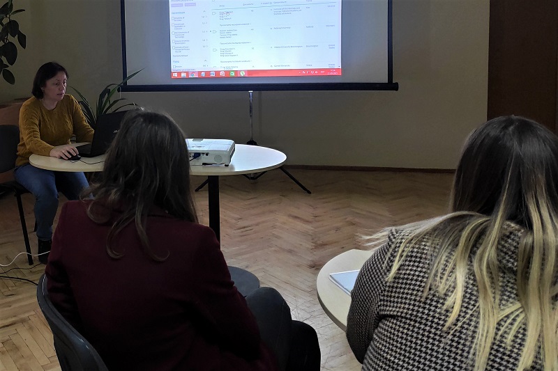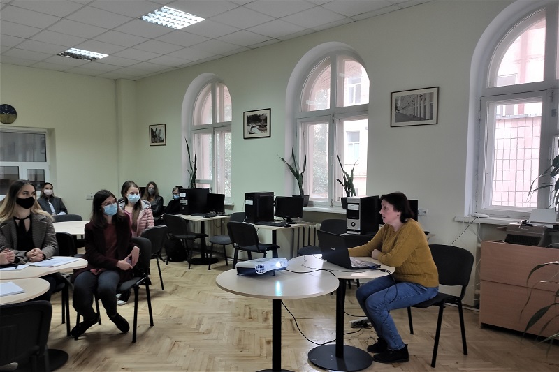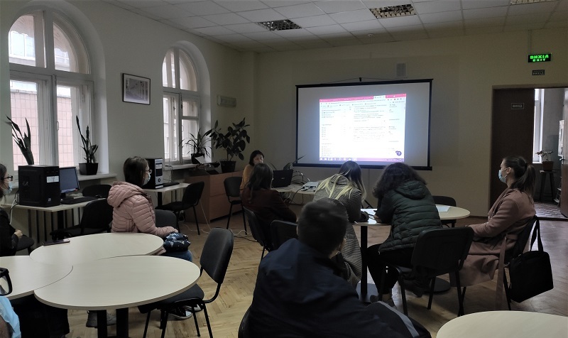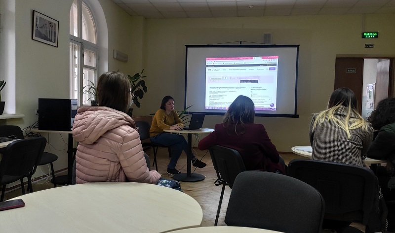 Разом із провідною фахівчинею відділу інформаційних технологій Валентиною Каленською магістранти поринули в світ користувача-науковця, який щодня моніторить різні бази даних і відшукує всю необхідну інформацію. Таким чином, здобувачі познайомились із наукометричними базами Scopus та Web of Science.