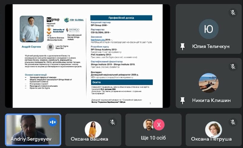 Нещодавно у межах вивчення нормативної дисципліни «Lean-виробництво харчової продукції» відбулася зустріч здобувачів освіти магістерської міждисциплінарної освітньої програми «Lean-виробництво харчової продукції» з Ph.D з економіки Університету Сандерленд (Великобританія), сертифікованим тренером Shingo Institute (США), експертом з ощадливого виробництва та Six Sigma, директором і партнером BPI Group Андрієм Сергєєвим. До зустрічі доєдналися викладачі кафедри експертизи харчових продуктів, кафедри автоматизації та комп’ютерних технологій систем управління і кафедри машин і апаратів харчових та фармацевтичних виробництв.