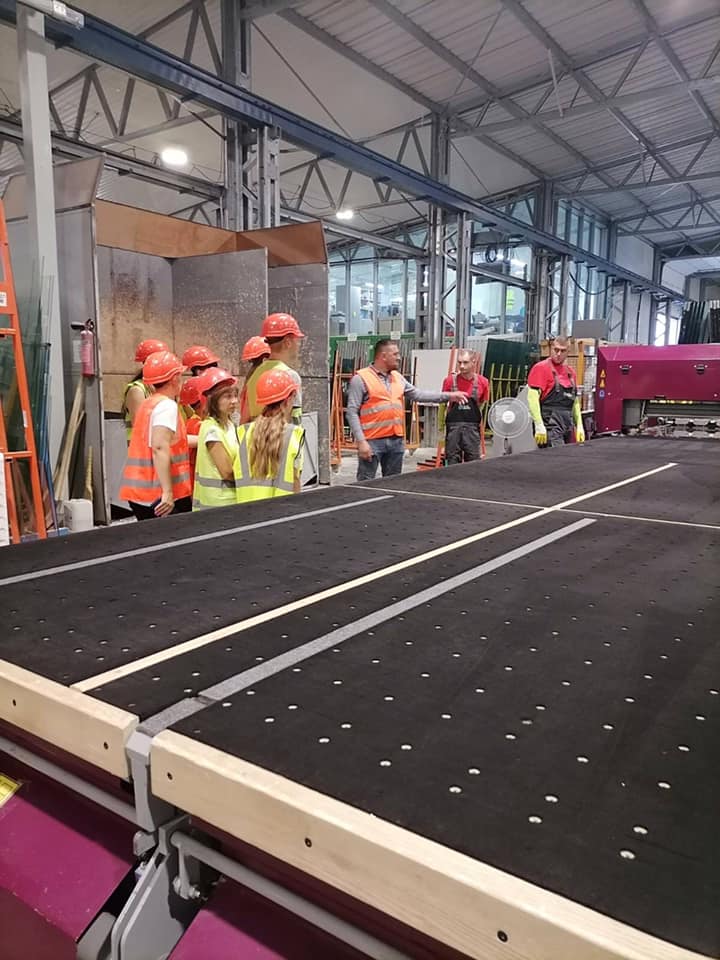 У ході екскурсії здобувачі ознайомилися з етапами порізки, гартування, гнуття, емалювання, триплексацією та складанням у готові склопакети скла. Випробували міцність і пластичність гартованого скла.