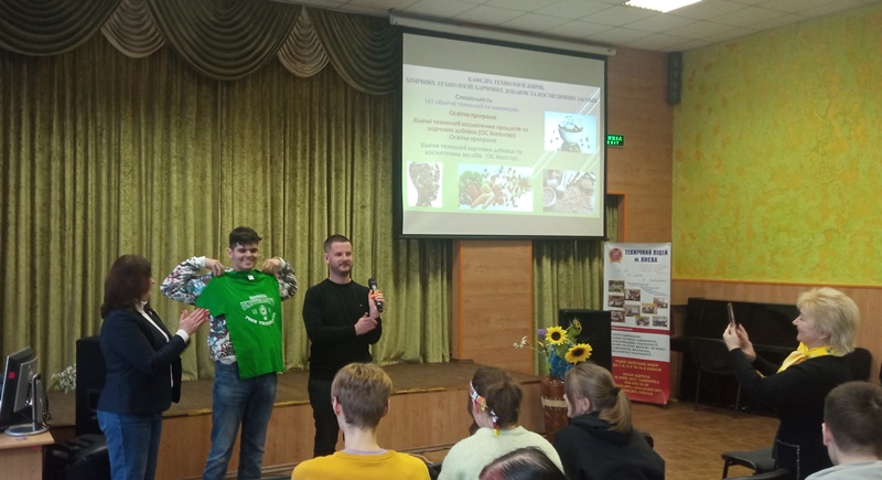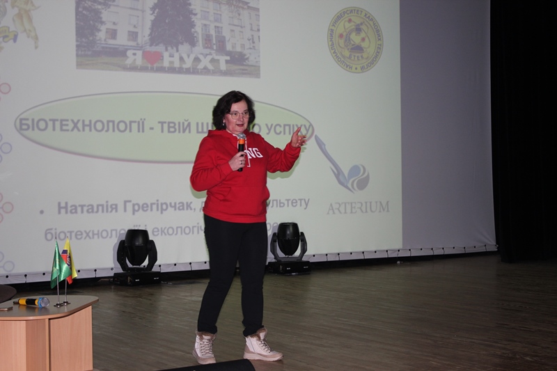 Наталія Грегірчак познайомила з поняттям «біотехнологія», висвітлила сучасні тренди та напрями розвитку біотехнологій (червону, зелену, сіру тощо), детально зупинилась на сучасному етапі підготовки біотехнологів у НУХТ, окресливши можливості розвитку та формування професійних навиків – hard skills і soft skills. Дуже сподобалася присутнім вікторина про НУХТ та біотехнології від нашої деканки, де розігрувалися призи і подарунки, в тому числі від партнерів університету. А наприкінці свого виступу вона запросила учнів до участі у «Біотехнологічних студіях НУХТ».