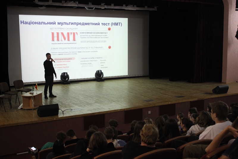 Артем Ущаповський познайомив гімназистів із особливостями вступної кампанії 2024 та надав цінні лайфхаки, що допоможуть підвищити конкурсний бал при вступі – участь у Всеукраїнських учнівських олімпіадах НУХТ у 2024 році та підготовка до НМТ на підготовчих курсах університету.