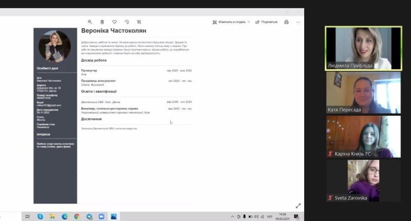 Здобувачі мали змогу ознайомитися з видами резюме, його структурою, вимогами щодо його укладання та типовими помилками, що в ньому трапляються. За допомогою різних сервісів і конструкторів здобувачі оформлювали свої «перші ластівки».