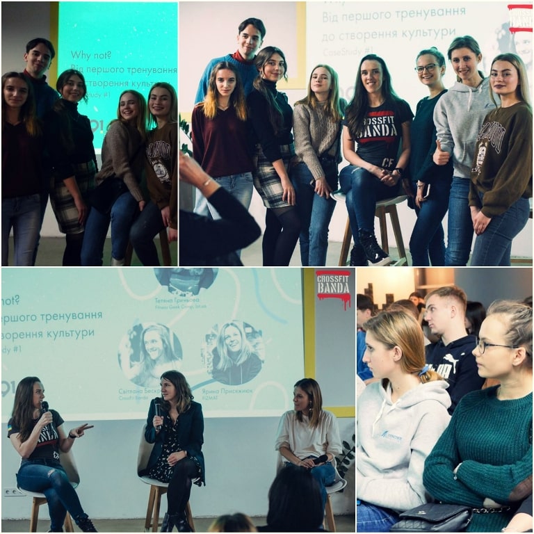 Управлінці персоналом знову в центрі актуальних подій столиці. У хабі для громадських ІТ-організацій і стартапів 1991 Civic Tech Center викладачі та студенти-ейчари зустрілись із успішними жінками, що розвинули бізнес у форматі спортивних спейсів нового покоління, – директоркою першої в Україні мережі афілійованих кроссфіт клубів CrossFit Banda Світланою Бескровною та власницею фітнес-клубу FIZMAT Яриною Присяжнюк. Модератором зустрічі стала Тетяна Гриньова, видавець lifestyle-видання bit.ua, яка теж займається просуванням спортивних проектів – фітнес-табору Fitness Geek Camp і додатку Fitior із пошуку партнерів для занять спортом.