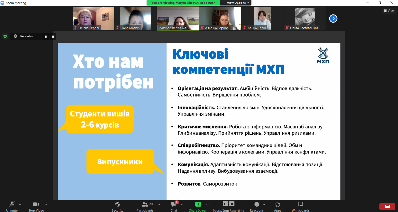 25 жовтня 2022 р. відбулася зустріч здобувачів освітніх ступенів «бакалавр» і «магістр» освітньо-професійної програми «Менеджмент персоналу» з керівницею відділу професійного навчання ПрАТ «МХП» Оленою Азєєвою і фахівчинею по роботі з молоддю Мариною Шептицькою.