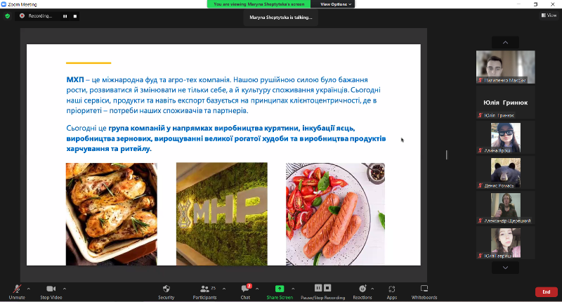 Спікерки ознайомили здобувачів із історією розвитку компанії МХП ‒ вертикально-інтегрованого лідера українського аграрного виробництва з європейським акціонерним капіталом і закордонними виробничими активами, що працює в галузях птахівництва, рослинництва, зерноперероблення, виробництва комбікормів, м'ясоперероблення і тваринництва. Фахівчині зазначили, що МХП об'єднує понад 28 тисяч співробітників на понад 40 підприємствах у 17 регіонах України та близько 4 тисяч співробітників за кордоном. Зокрема, компанія неодноразово була представлена в «ТОП-10 кращих українських роботодавців», а також отримувала нагороду «HR-лідер в інноваціях» на HR Wisdom Summit.