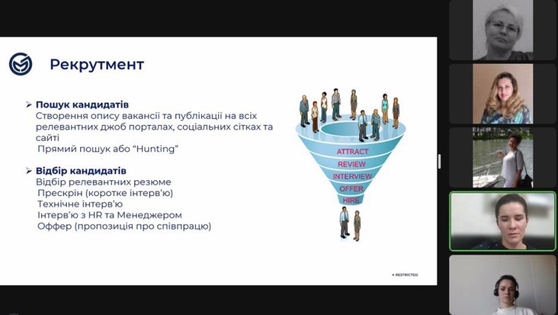 Заріна Бандрівська зосередила увагу на особливостях рекрутингу в ІТ-сфері та розкрила підходи до менеджменту персоналу в компанії Global-Mediator. Відбулося жваве обговорення можливості обіймання різних посад випускниками НУХТ в ІТ-сфері. Фахівчині обґрунтували необхідні навики, які повинні отримати здобувачі для працевлаштування та ефективної роботи.