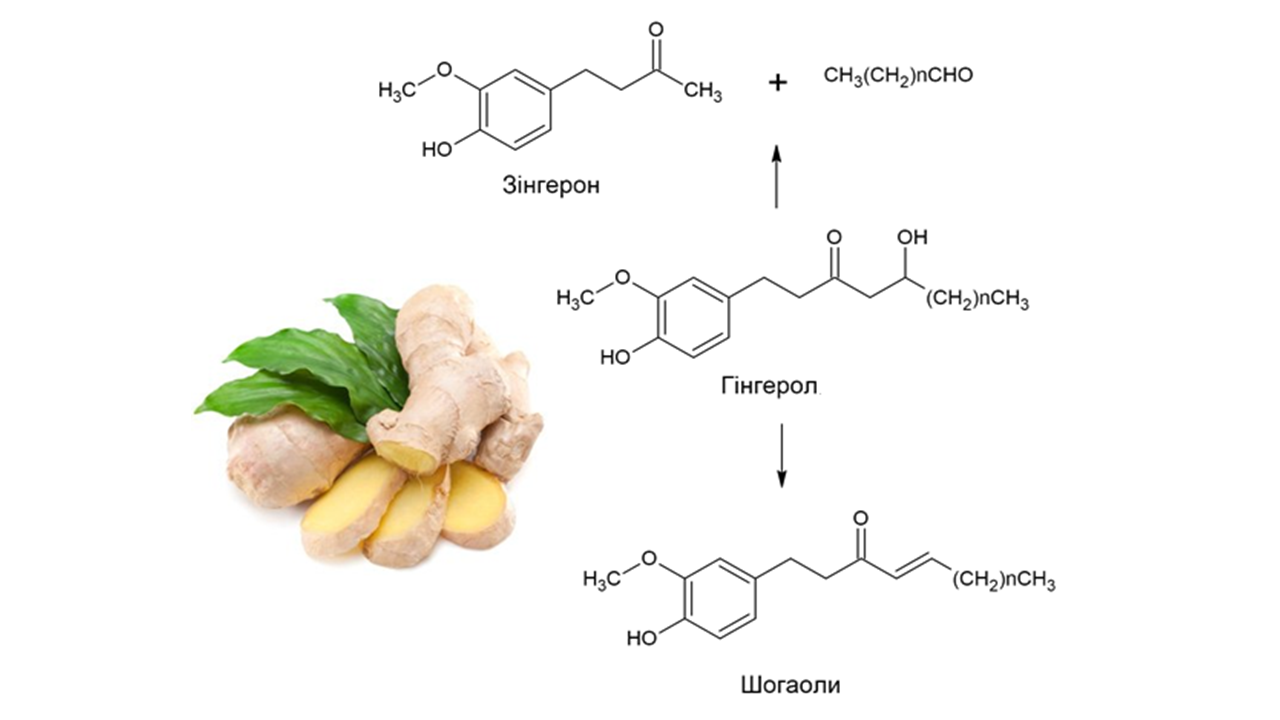 В корені імбиру міститься речовина гінгерол, яка і надає йому специфічний смак. Вона має антиканцерогенні, антиоксидантні та протизапальні властивості. Гінгерол чутливий до нагрівання – при сушінні або тепловому обробленні харчових продуктів гінгерол дегідратує до шогаолів, або розкладається до альдегідів і зінгерону. Зінгерон менш гострий ніж гінгерол і має пряно-солодкий аромат. Шогаоли більш ніж вдвічі мають гострий смак, що пояснює, чому сушений імбир більш гостріший, ніж свіжий.
