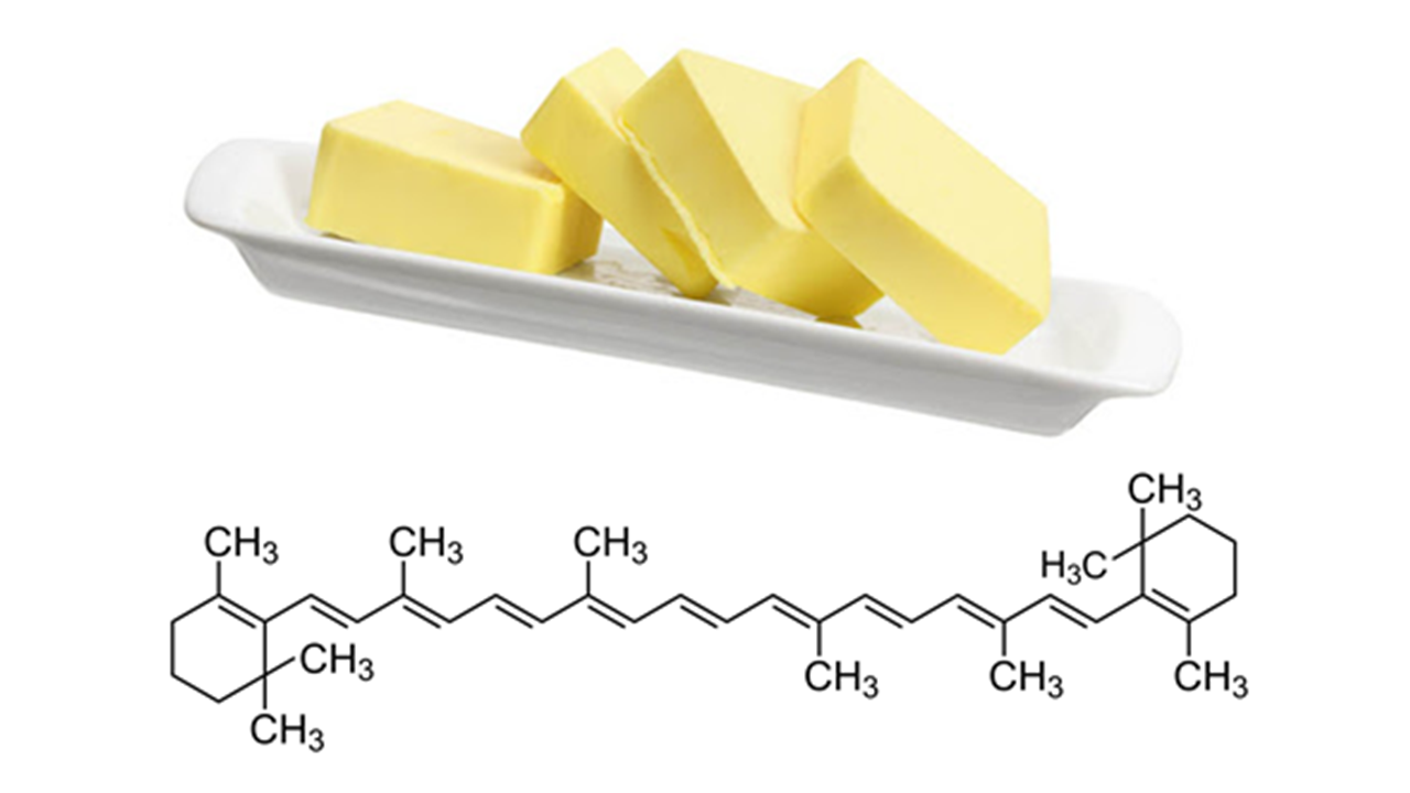 Основним пігментом у молочному жирі є β-каротин, який становить близько 95% загальної кількості присутніх каротиноїдів. В молоці β-каротин міститься в ядрі глобул молочного жиру і відсутній у мембрані. Концентрація β-каротину в молоці залежить від його рівня в кормі та від породи корів. Каротиноїдних пігментів особливо багато в свіжій траві, але значно нижчий їх вміст у суміші концентрату та сіна – нормального зимового корму. У Новій Зеландії корови, яких годували свіжою весняною травою, можуть давати молоко, яке містить β-каротину до 13 мг на 1 г жиру (порода Джерсі) або 8 мг на 1 г жиру (фризька порода). Однак, коли корови пасуться на зрілому літньому пасовищі, ці показники значно зменшуються до приблизно 7 мг та 4 мг на 1 г жиру для порід Джерсі та фризької відповідно. З огляду на ці варіації, не дивно, що вміст β-каротину в комерційних маслах становить від 2,5 до 12.5 мг на 1 г жиру.