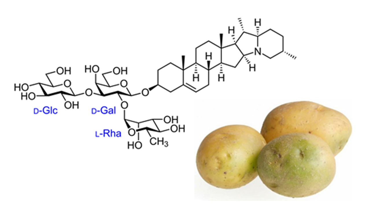 Соланін – алкалоїд, біологічна роль якого полягає в захисті рослини від поїдання шкідниками та від хвороб. Ця отруйна речовина міститься в картоплі в невеликих кількостях (2 -11 мг%), в шкірці її вміст сягає 60 мг%. При неправильному зберіганні картоплі відбувається її позеленіння, проростання і вміст соланіну різко збільшується. Отруєння соланіном можливі при приготуванні пюре з такої картоплі (разом з відваром) або при вживання разом з шкіркою. Токсична доза для людини становить 200 -400 мг соланіну.