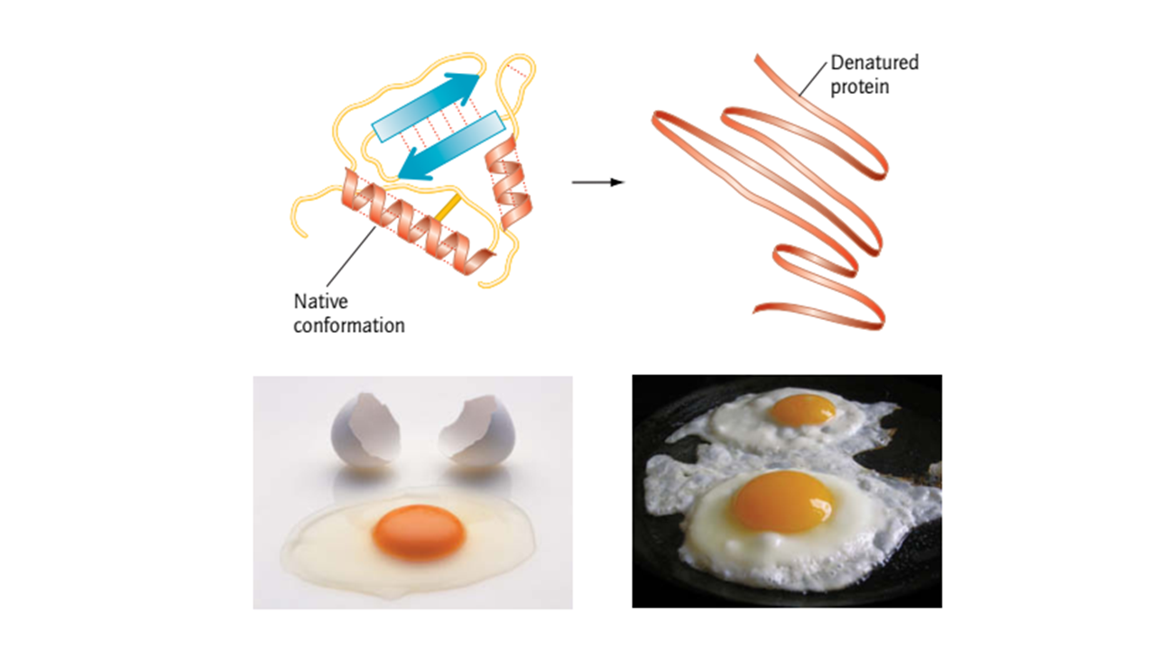 Білок денатурує, коли відбувається порушення вторинної, третинної або четвертинної структури білка, так що білок більше не може виконувати свою функцію. Денатурація білка не змінює його первинну структуру. Наприклад, білковий яєчний альбумін, знайдений в яєчних білках, може бути денатурований нагріванням, як проілюстровано на малюнку. Перехід від безбарвного до білого, який спостерігається при варінні яйця, є результатом денатурації білка. Готувати яйце – це приклад незворотної денатурації.