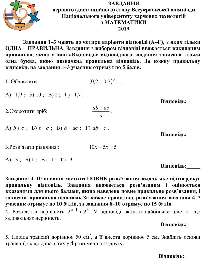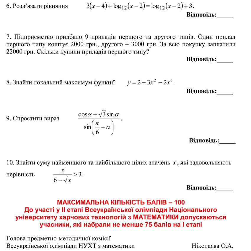 Зверніть увагу на те, що окремі завдання вимагають не тільки відповіді, а і повного розв’язку задачі, який підтверджує правильну відповідь!. Повні розв’язання задач дозволяється виконувати на звичайних аркушах, кожен з яких має бути підписаний прізвищем, іменем та по батькові учасника.