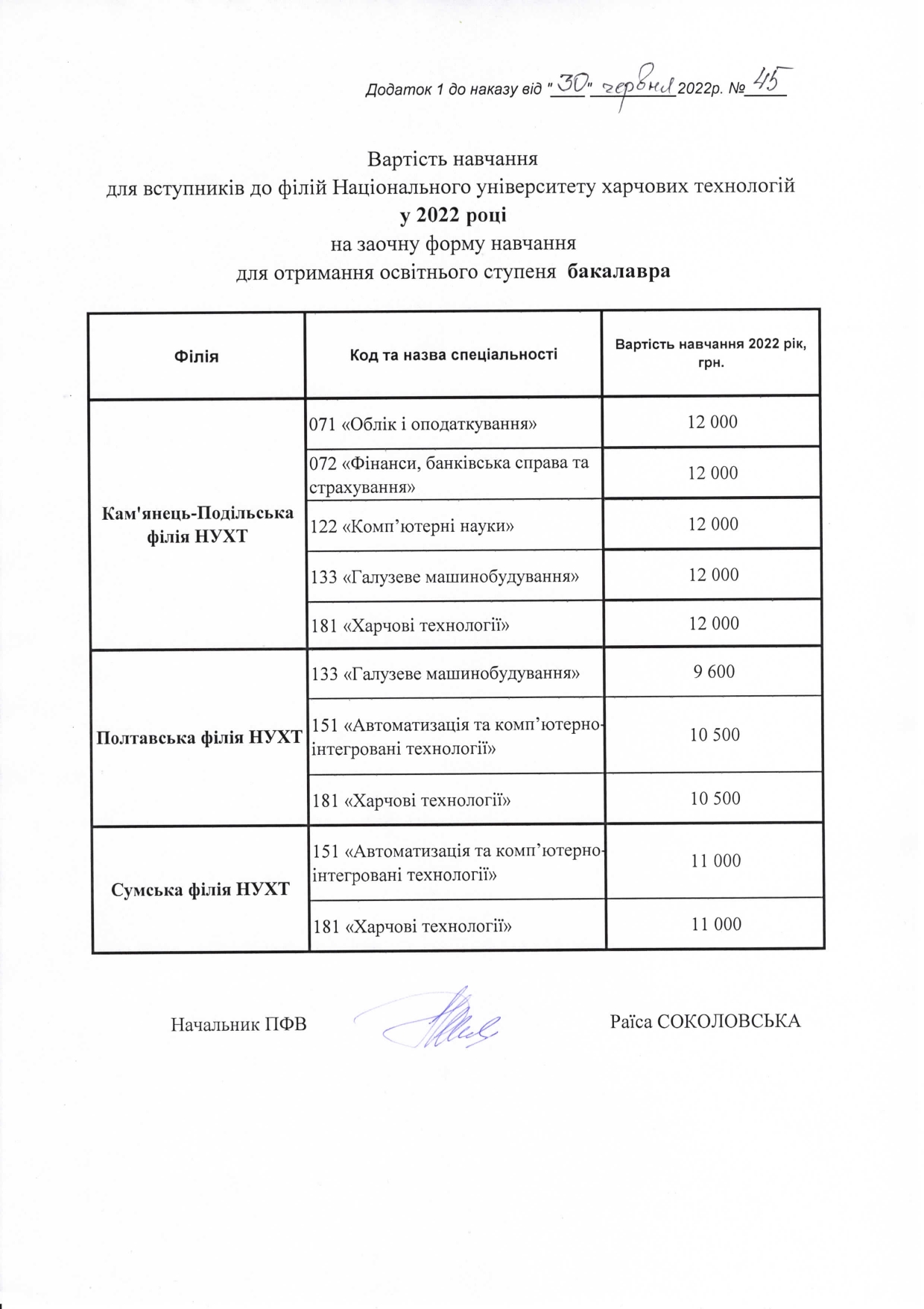 Вартість для вступників до філій НУХТ на заочну форму навчання - 2022