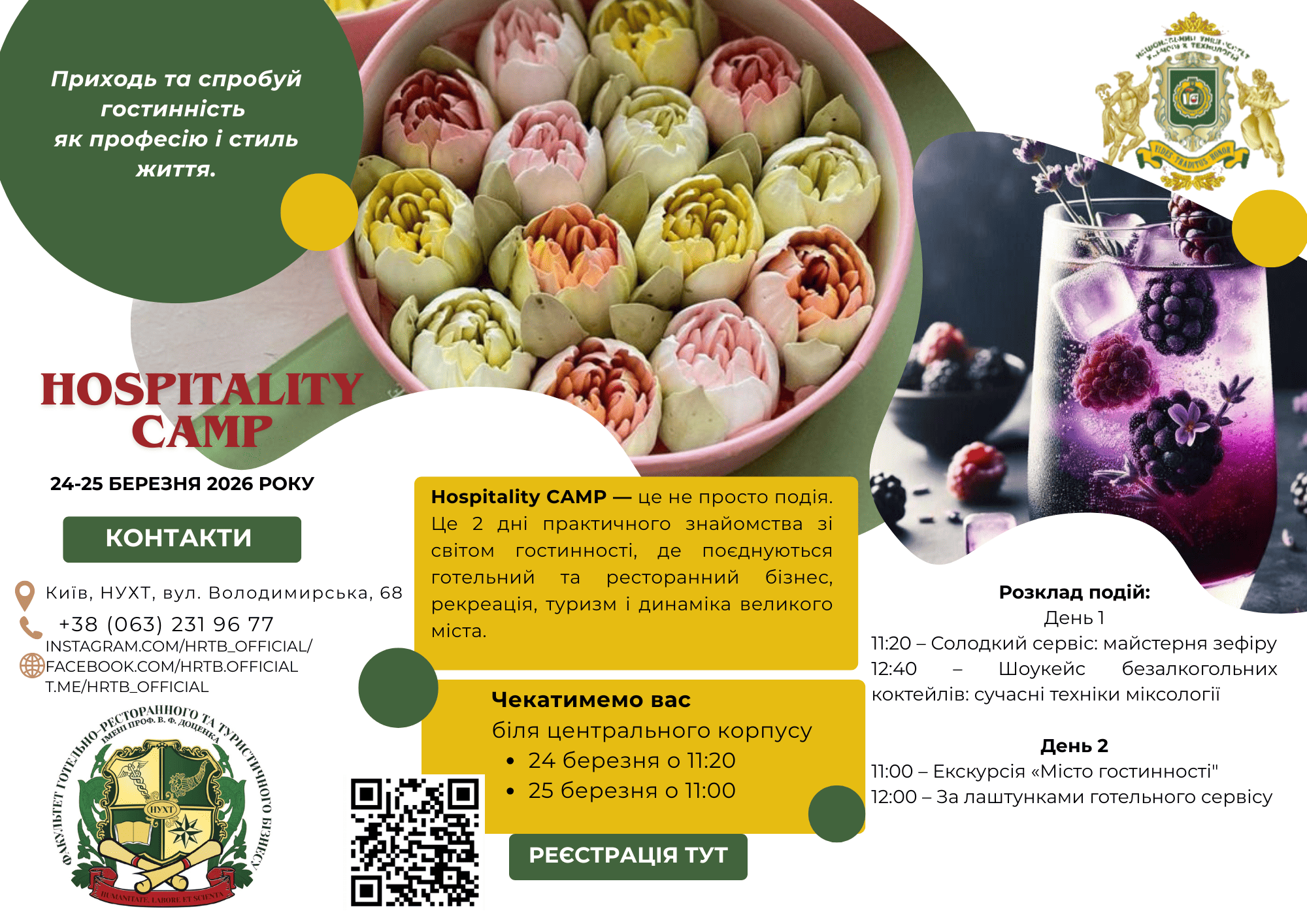 Факультет ГРТБ імені проф. В.Ф. Доценка запрошує вас долучитися до Hospitality CAMP і побачити індустрію гостинності зсередини: через практику, атмосферу, знайомство з професіями та реальними стандартами сервісу.