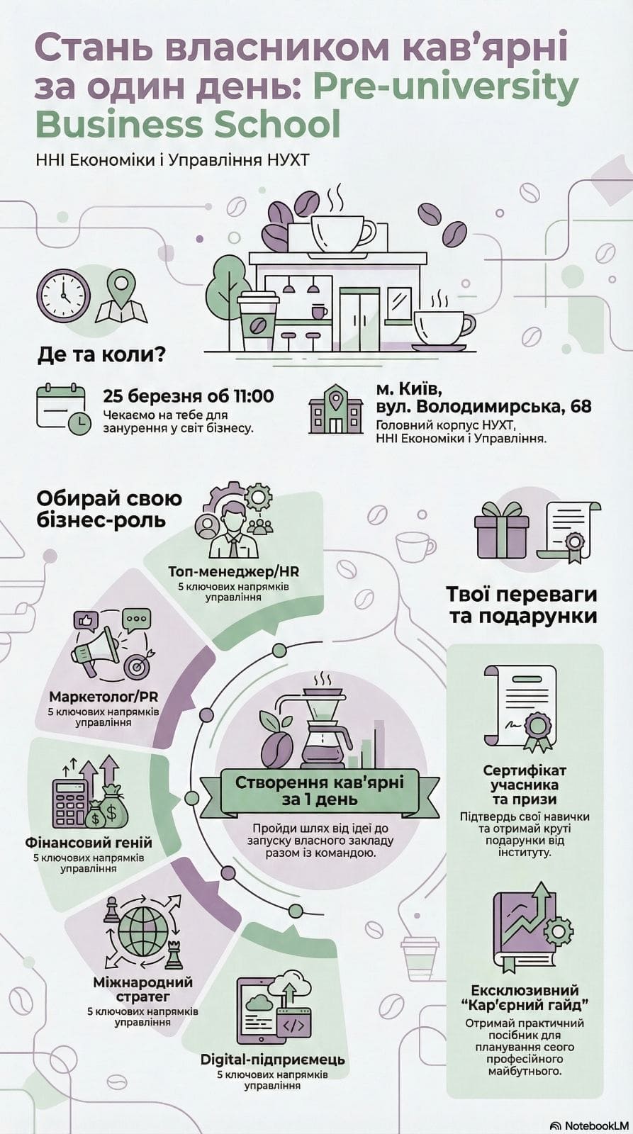 Pre-university Business School від навчально-наукового інституту економіки і управління запрошує тебе не просто на подію, а в реальний бізнес-досвід: разом відкриємо кав’ярню з нуля. Тут ти не слухаєш — ти дієш, пробуєш і розумієш, що тобі реально підходить.