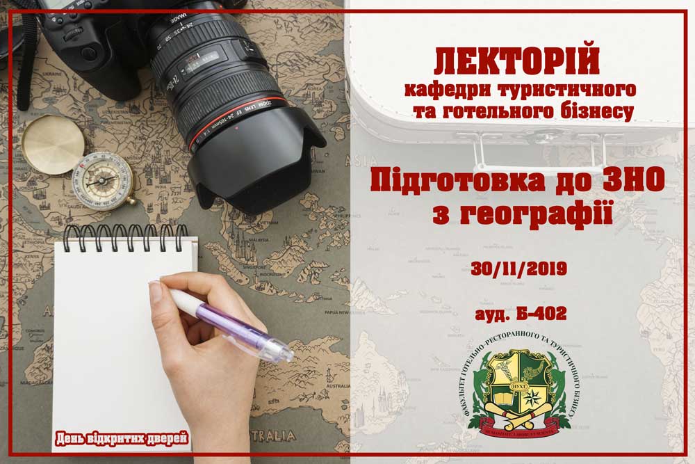 Кафедра туристичного та готельного бізнесу факультету готельно-ресторанного та туристичного бізнесу запрошує відвідати лекторій, присвячений підготовці до складання ЗНО з географії. Наша викладачі, експерти сфери туризму, проведуть для вас надзвичайно насичений тренінг, який дозволить максимально ефективно підготуватися до такого важливого і хвилюючого іспиту, як Зовнішнє Незалежне Оцінювання.