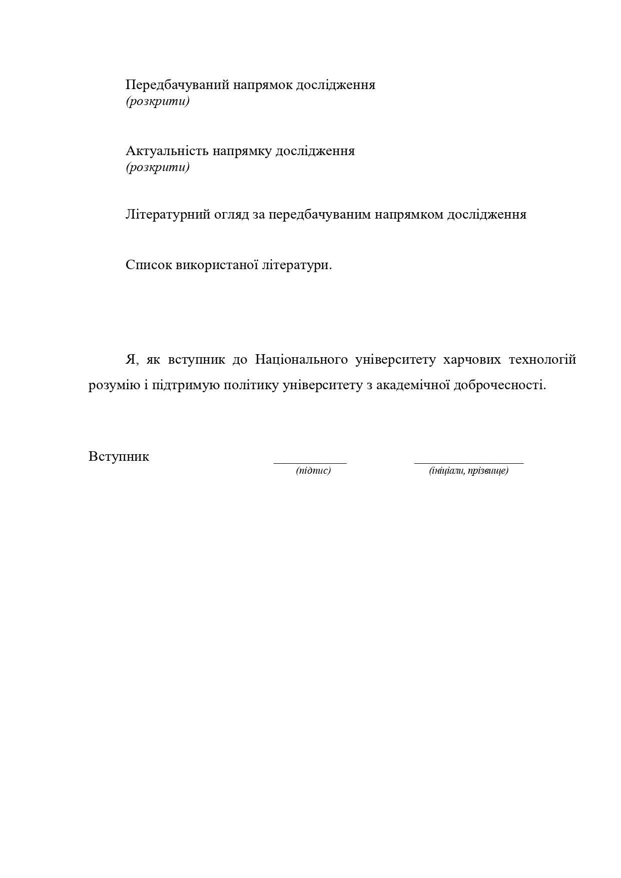 Дослідницька пропозиція з обраної спеціальності (освітньо-наукової програми) – це текст обсягом до 5 сторінок (без урахування титульного аркуша), підготовлений вступником до аспірантури, у якому обґрунтовується передбачуваний напрямок дисертаційного дослідження та його актуальність.