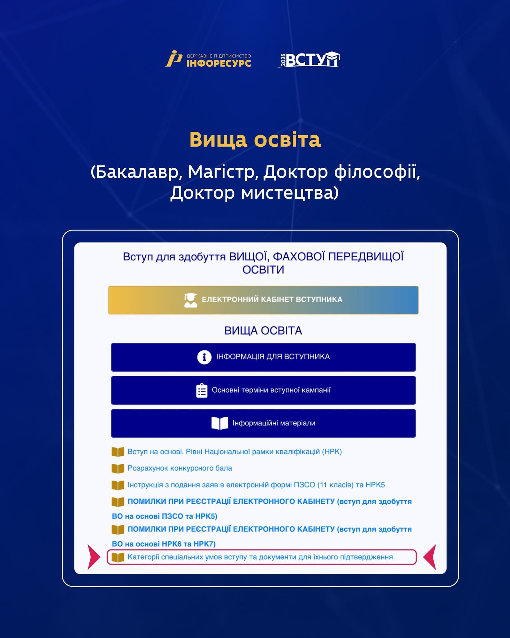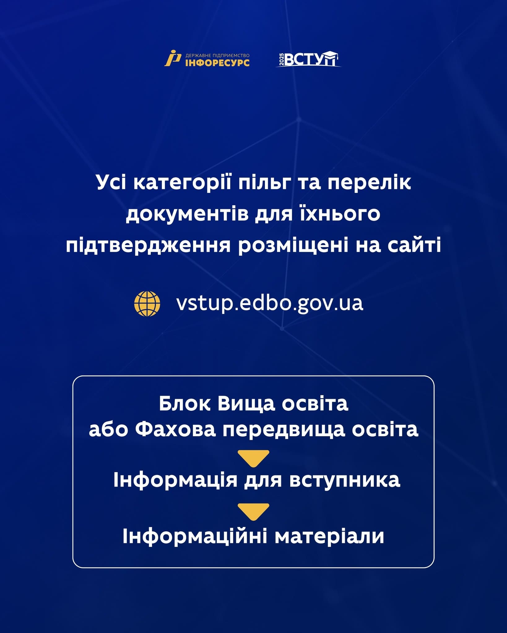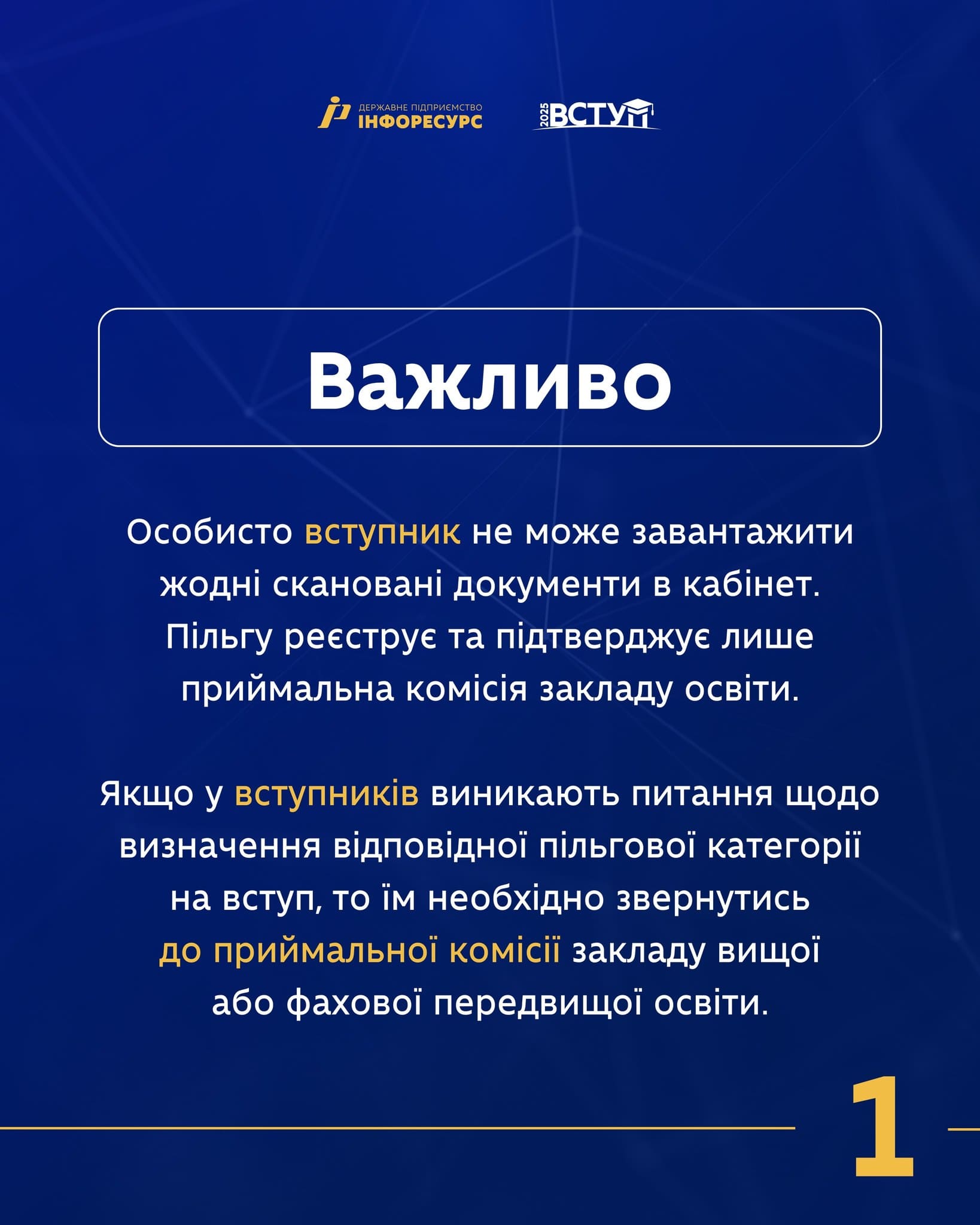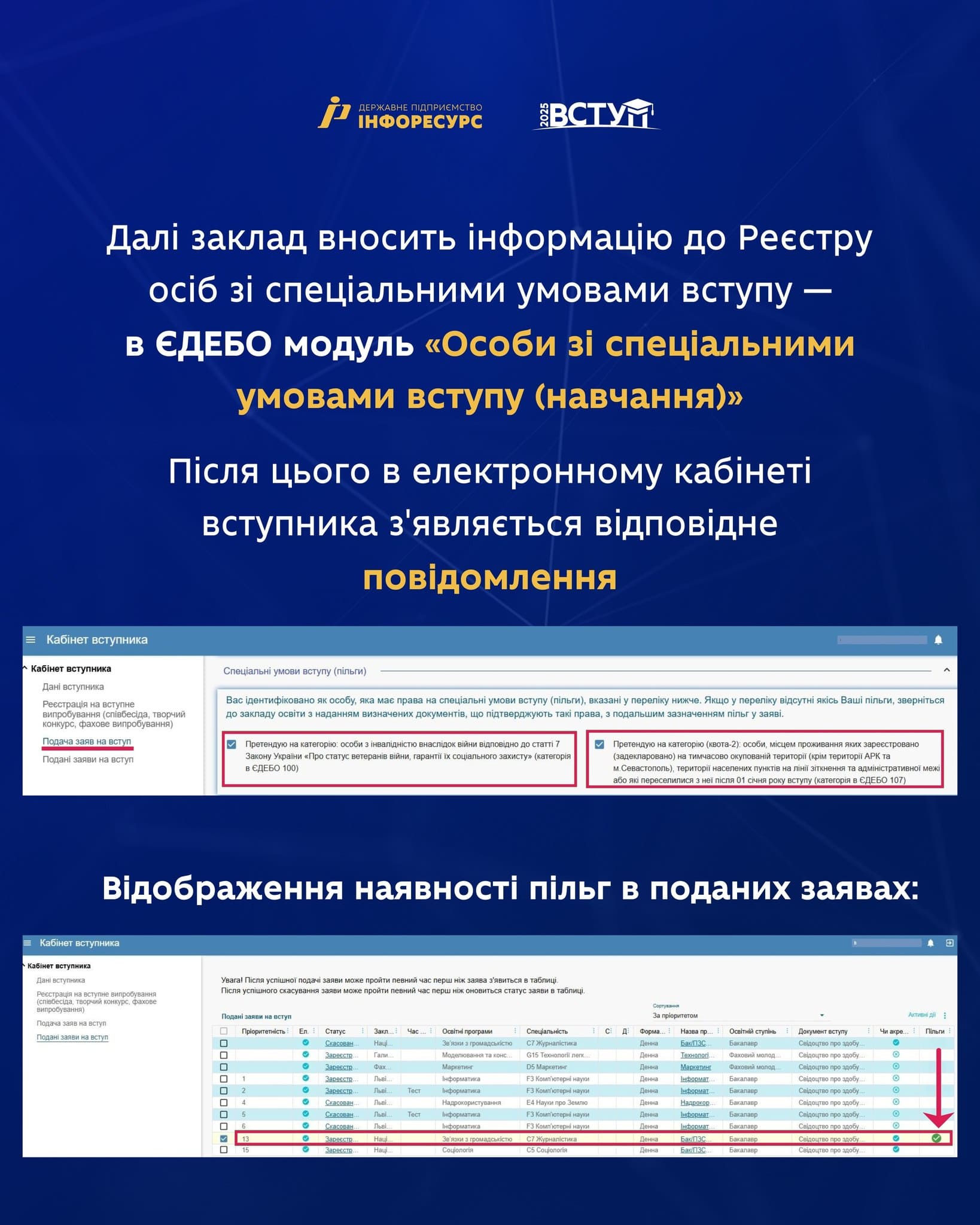 Для різних категорій пільг існують різні вимоги щодо переліку сканкопій документів, що завантажуються до реєстру. Після внесення ваших даних у реєстр в електронному кабінеті вступника ви побачите спеціальну позначку, що вас ідентифіковано як особу зі спеціальними умовами вступу.